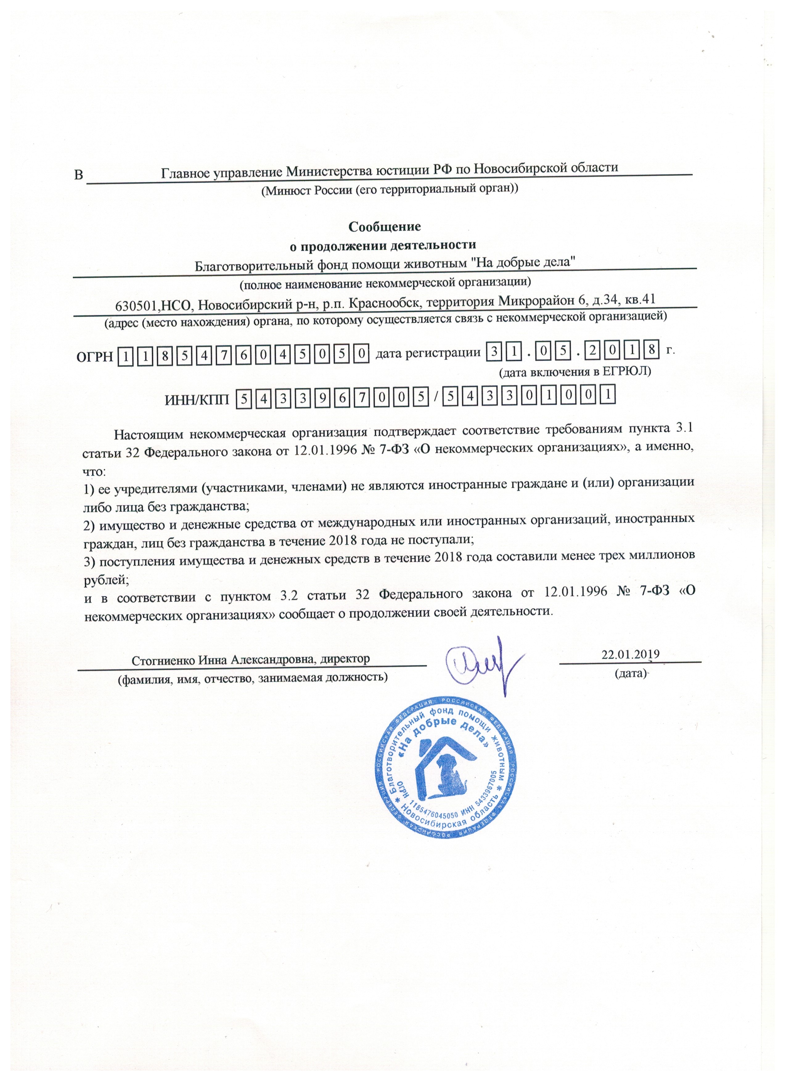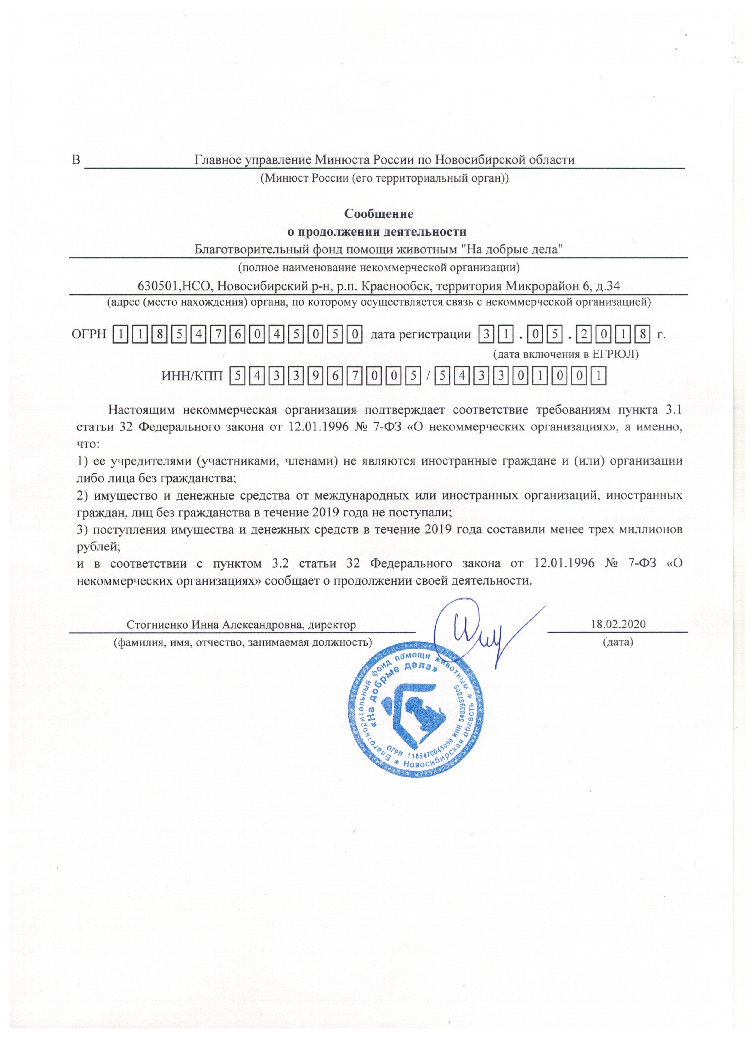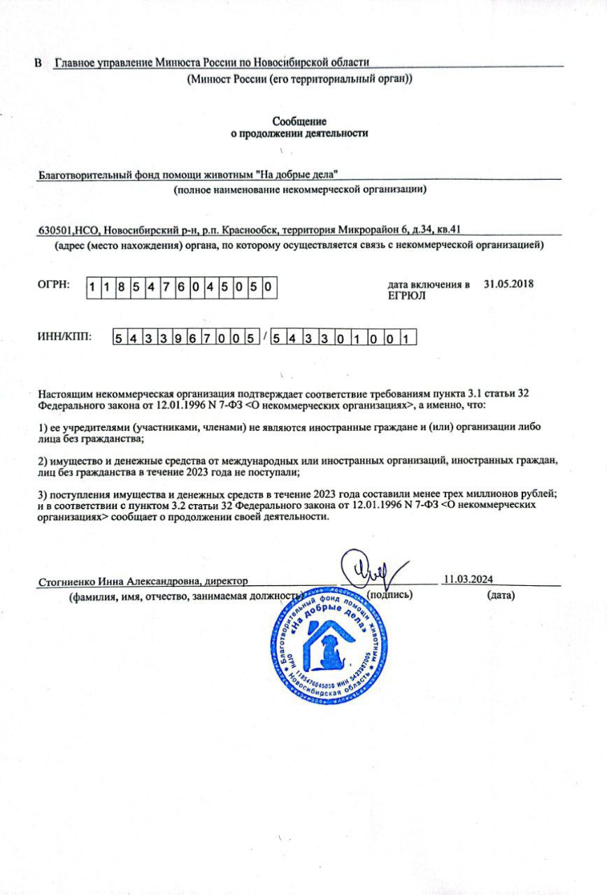 Этот день по праву считается днём рождения нашего Фонда. Именно в апреле 1998 года группа энтузиастов создала волонтёрское зоозащитное движение «НА ДОБРЫЕ ДЕЛА», которое 31 мая 2018 года прошло государственную регистрацию в виде Благотворительного Фонда помощи животным "НА ДОБРЫЕ ДЕЛА" (ОГРН 1185476045050) учётный номер в реестре благотворительных организаций Министерства юстиции РФ 5414010994
